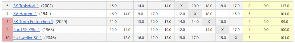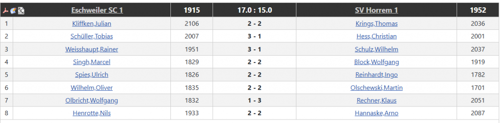 Eine alles in allem unglückliche Niederlage für Horrem, die weiterhin auf einem Nichtabstiegsplatz stehen. Die Verfolger haben jedoch nur einen bis 2 Mannschaftspunkte weniger, so dass es auf die letzten beiden Runden ankommen wird.