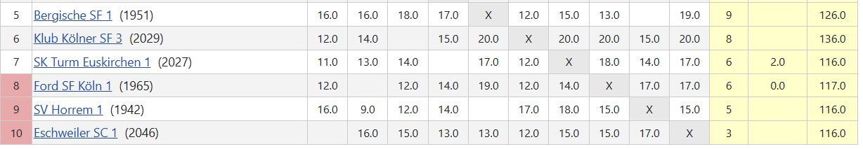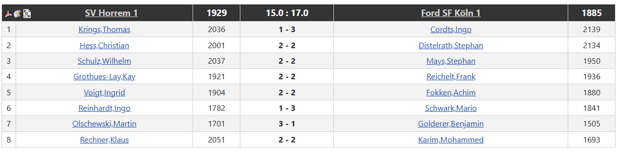 Unerfreulich aus Horremer Sicht das Ergebnis bei Ingo an Brett sechs: Ingo, der sich bislang so erfolgreich durch die Regionalliga spielte, fand bei heterogenen Rochaden nicht den rechten Hebel für die gegnerische Königsstellung. Der Ausgleich für die Gegner.