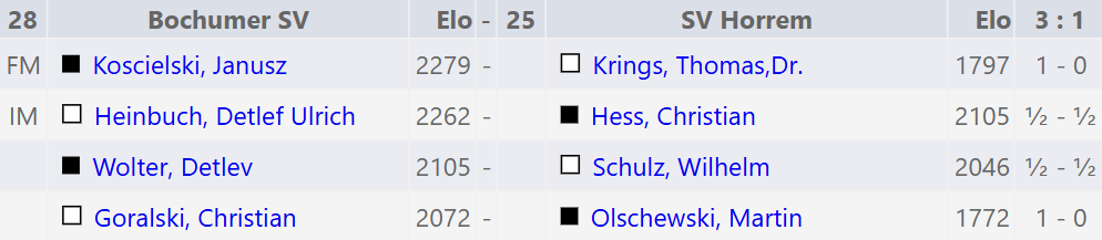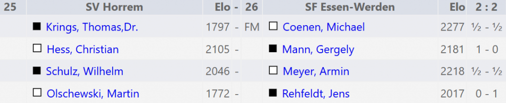 Entstand 2:2 Unentschieden. Da Horrem jedoch an Brett 2 gewann und 4 verlor, war Horrem aufgrund der besseren Berliner Feinwertung für den nächsten Tag qualifiziert.