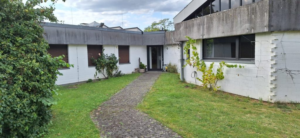 Der Zugang zum Gemeinderaum erfolgt wie immer durch das Tor zum Martin Luther Haus und dann um das Gebäude herum gehen. Von der Rückseite des Martin Luther Haus seht ihr dann den Eingang des Gemeinderaumes.